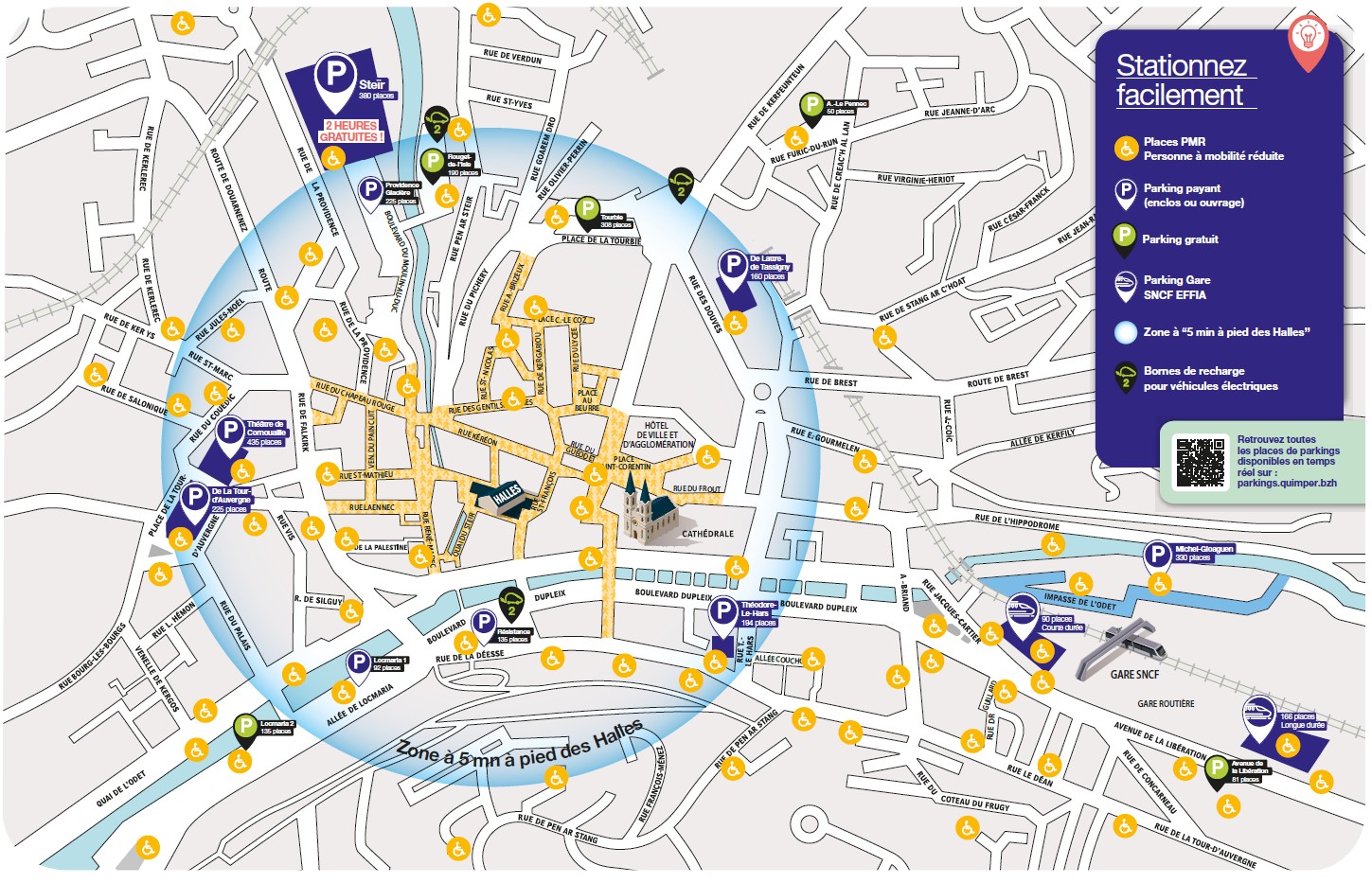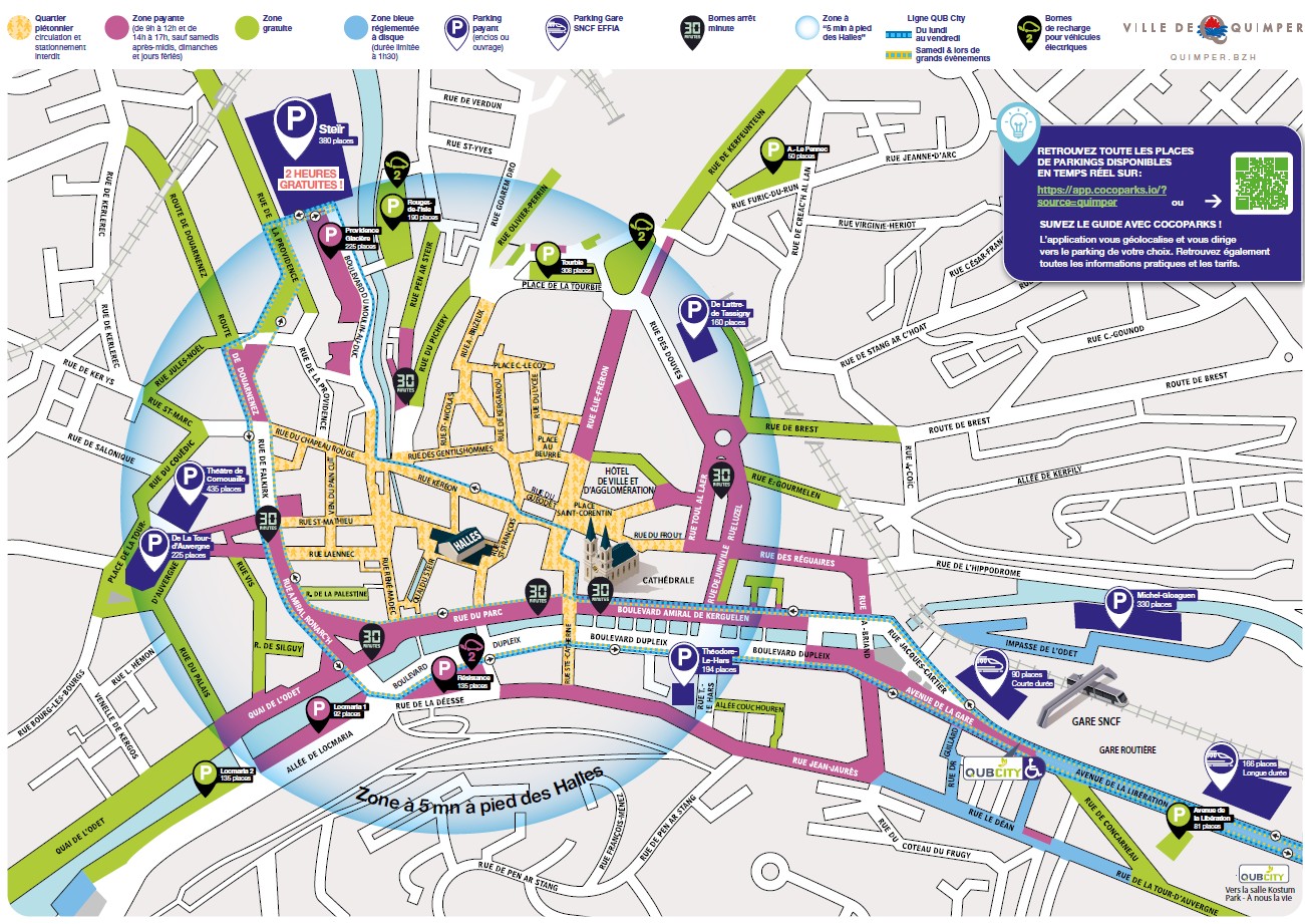 La ville de Quimper dispose, en centre-ville, de 5 587 places de stationnement qui se décomposent de la manière suivante :
