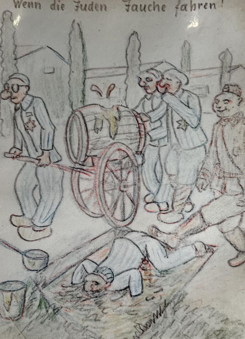 A l’origine ce sont des dessins exécutés sur des cartons de boîtes à chaussures. Les dessins ont été reproduits, numérisés et agrandis pour les besoins de l’exposition. Les élèves de collège Louis Aragon de Villefontaine ont légendé les dessins. Ces dessins illustrent le calvaire d’un déporté.