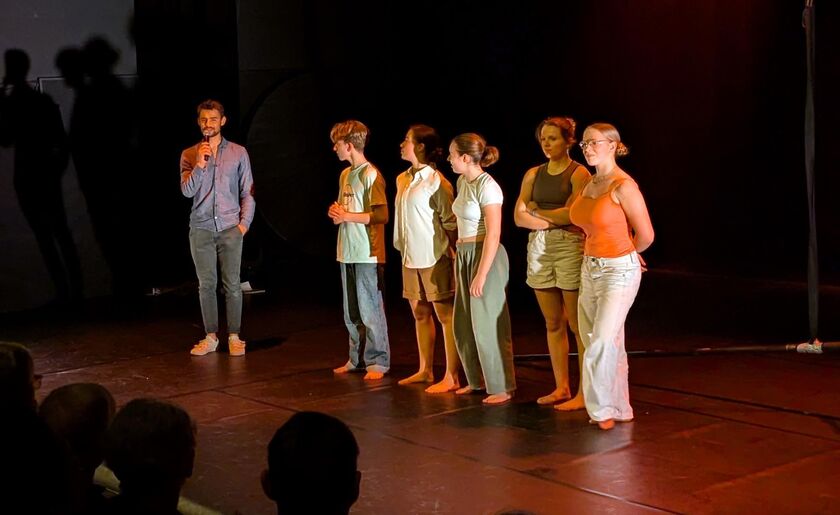 À l'issue d'un travail en complicité avec la compagnie Libertivore, du spectacle Ether, les élèves de perfectionnement de l'école de cirque Balles à fond présentent une « sortie de chantier » à l'Atelier du Théâtre de Cornouaille, dans le cadre du festival Circonova.